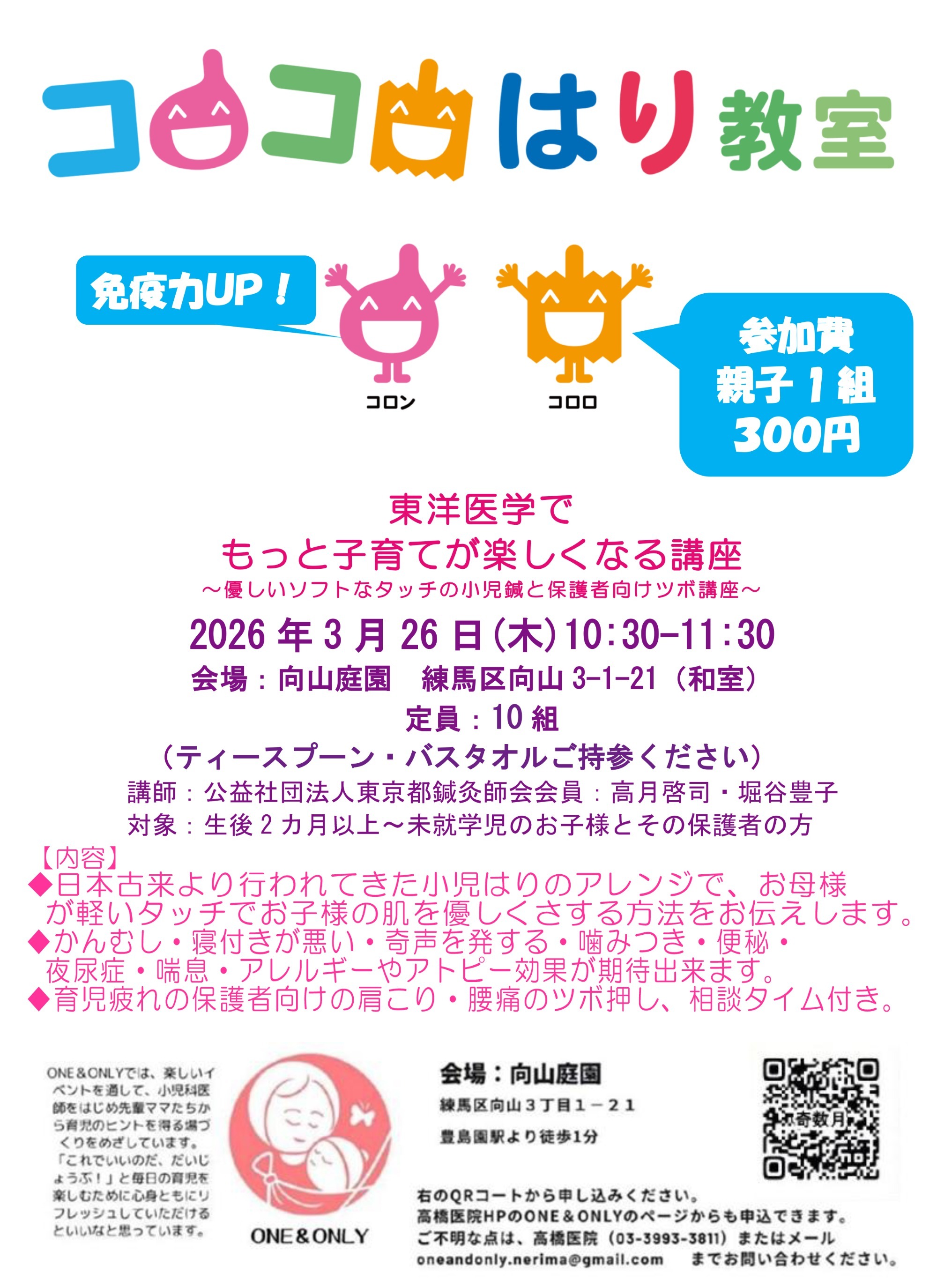 高橋医院では、お母さん、お父さんたちとおこさんの癒しの場所として、ONE&ONLYという会を立ち上げることとなりました。